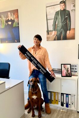 Die FIRST MODEL Siegerschärpe ist heute im Office eingetroffen und wird von Phönix bewacht.